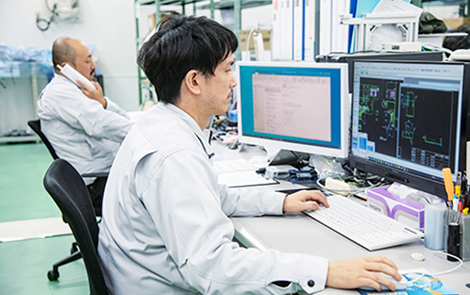 設計・プログラミング・VE 加工や組立の知識をもった開発者・設計者が複数在籍。量産を前提とした効率的な機械設計が可能です。すでに設計図がある場合でも、量産に合わせた設計図のチェックや修正のご提案も可能。量産に入る前段階から安心してご依頼いただけます。また、機械装置制御のプログラミングについてもお任せいただけます。
