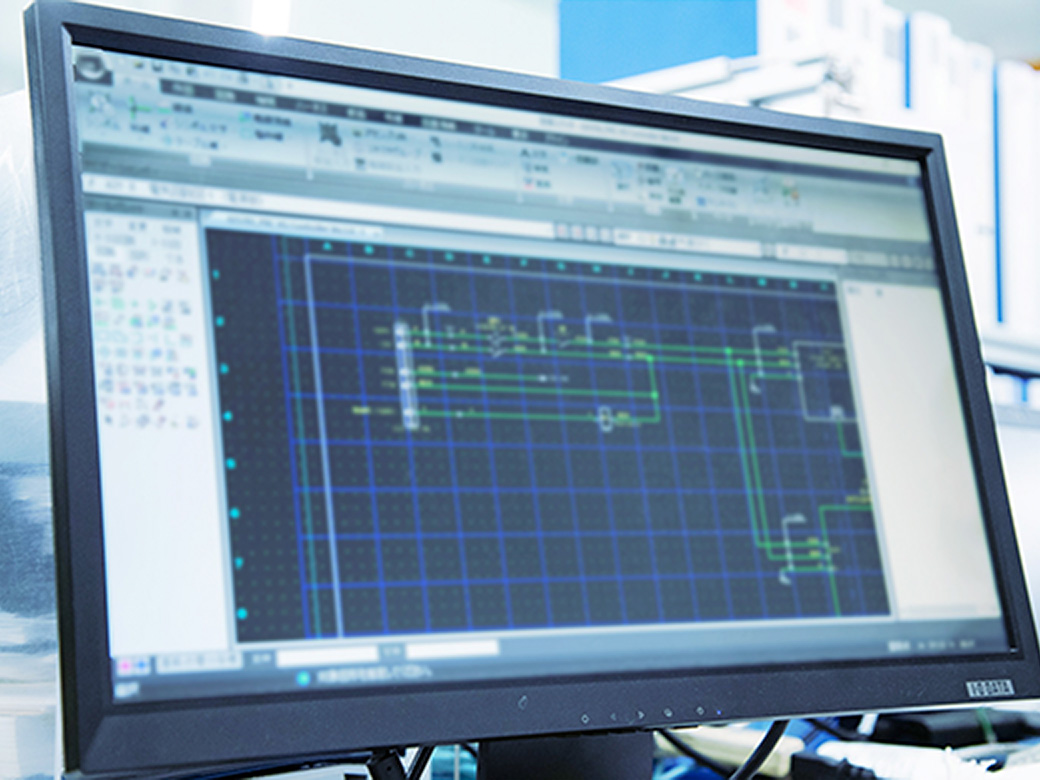 多数の大型製品の組み立てやクリーンブース環境下での装置組み立てにも対応。治具の設計からヘリウムリークディテクターの検査、既存の装置の改造、ポンチ絵のアイディアからの装置構想、PLCの選定から、シーケンサーのプログラム、タッチパネルのデザイン設計まで、幅広く対応いたします。